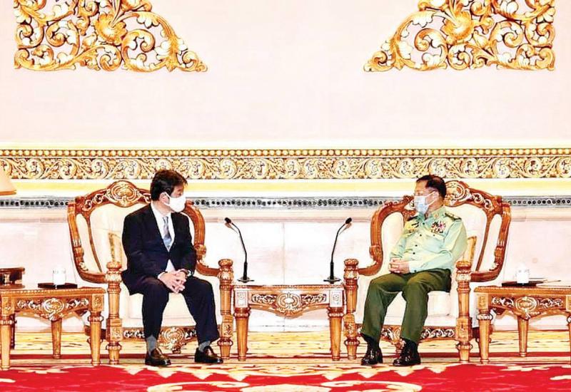 တပ်မတော်ကာကွယ်ရေးဦးစီးချုပ် ဗိုလ်ချုပ်မှူးကြီး မင်းအောင်လှိုင်သည် ဂျပန်နိုင်ငံခြားရေး ဝန်ကြီးဌာန ဝန်ကြီး မစ္စတာ မိုတဲဂိတိုရှိမိစု ဦးဆောင်သော ကိုယ်စားလှယ်အဖွဲ့အား ယနေ့ညနေပိုင်း တွင် နေပြည်တော်ရှိ ဇေယျာသီရိဗိမာန်ဧည့်ခန်းမဆောင်၌ လက်ခံတွေ့ဆုံသည်။