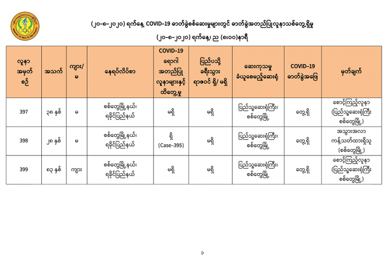 ၁။ (၂၀-၈-၂၀၂၀) ရက်နေ့အတွက် COVID-19 ရောဂါ ဓာတ်ခွဲစစ်ဆေးရာတွင် -