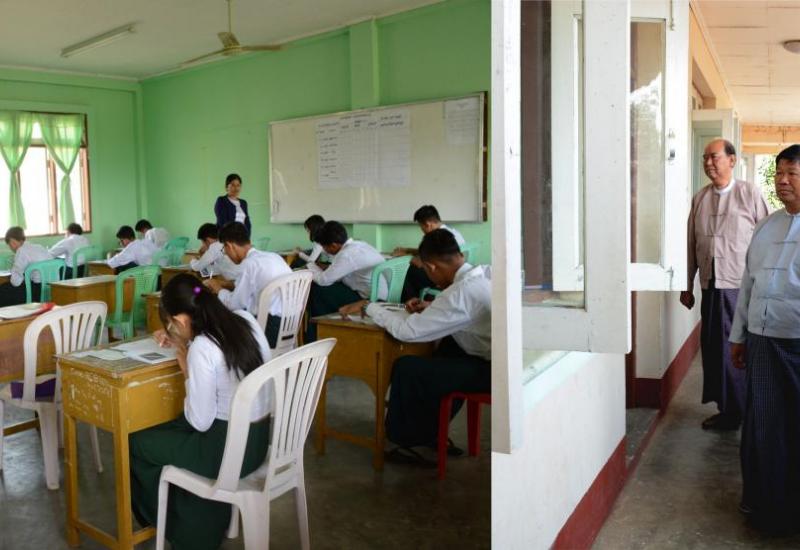 ဌာန၌ ကျောင်းသူကျောင်းသားများ မြန်မာစာဘာသာ ဖြေဆိုနေမှုများနှင့် စာမေးပွဲဆိုင်ရာ လုပ်ငန်းဆောင်ရွက်နေမှုများကို ပညာရေး၀န်ကြီးဌာန ပြည်ထောင်စု၀န်ကြီး ဒေါက်တာ မျိုးသိမ်းကြီး၊ ဒုတိယဝန်ကြီး ဦးဝင်းမော်ထွန်းနှင့် နေပြည်တော်ကောင်စီဝင် ဦးတင်ထွန်းတို့က လှည့်လည်ကြည့်ရှု အားပေးကြသည်။