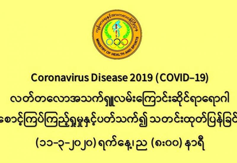 ၁။ ကျန်းမာရေးနှင့်အားကစားဝန်ကြီးဌာနသည် ကမ္ဘာ့နိုင်ငံများတွင် ကူးစက်ပျံ့နှံ့လျက်ရှိသည့် COVID-19 လတ်တလောအသက်ရှူလမ်းကြောင်းဆိုင်ရာ ရောဂါဖြစ်ပွားမှုဖြစ်စဉ်နှင့်ပတ်သက်၍ ရောဂါစောင့်ကြပ်ကြည့်ရှုခြင်း လုပ်ငန်းများအား အပြည်ပြည်ဆိုင်ရာ ဝင်ပေါက်၊ ထွက်ပေါက်ဂိတ် များတွင်လည်းကောင်း၊ ဆေးရုံအခြေပြုအဖြစ်လည်းကောင်း၊ ပြည်သူလူထုအခြေပြု စောင့်ကြပ် ကြည့်ရှုခြင်းလုပ်ငန်းများဖြင့်လည်းကောင်း၊ ပုဂ္ဂလိကဆေးရုံများနှင့် ပူးပေါင်း၍လည်းကောင်း ဆောင်ရွက်လျက်ရှိပါသည်။