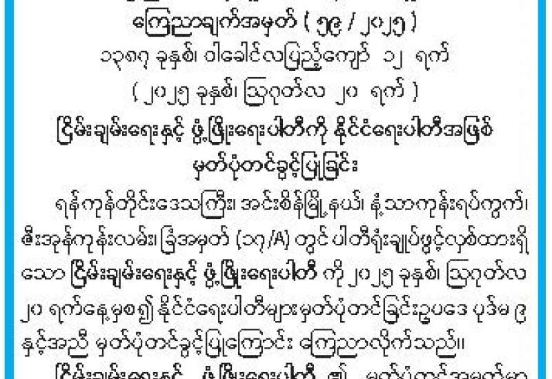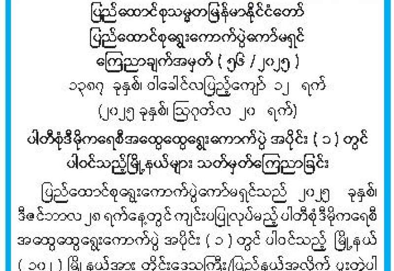 ပါတီစုံဒီမိုကရေစီအထွေထွေရွေးကောက်ပွဲ အပိုင်း (၁) တွင် ပါဝင်သည့် မြို့နယ်များ သတ်မှတ်ကြေညာခြင်း