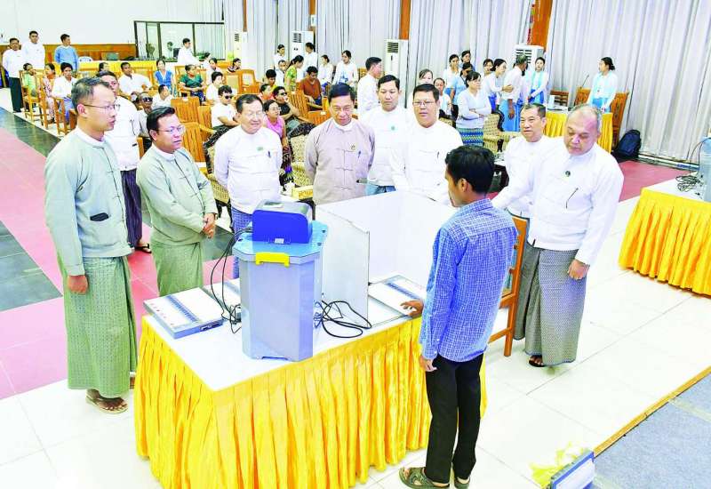မသန်စွမ်းသူများကိုယ်တိုင် ဆန္ဒမဲပေးနိုင်ရေးအသိပညာပေးခြင်းနှင့် မြန်မာအီလက်ထရောနစ်မဲပေးစက် လက်တွေ့စမ်းသပ်အသုံးပြုခြင်းအစီအစဉ်ကို ယနေ့ နံနက် ၁၀ နာရီတွင် လူမှုဝန်ထမ်း၊ ကယ်ဆယ်ရေးနှင့်ပြန်လည်နေရာချထားရေးဝန်ကြီးဌာန စုပေါင်းအစည်းအဝေးခန်းမ၌ ကျင်းပရာလူမှုဝန်ထမ်း၊ ကယ်ဆယ်ရေးနှင့်ပြန်လည်နေရာချထားရေးဝန်ကြီးဌာန ပြည်ထောင်စုဝန်ကြီး ဒေါက်တာစိုးဝင်း၊ ပြည်ထောင်စုရွေးကောက်ပွဲကော်မရှင်အဖွဲ့ဝင် ဦးအောင်လွင်ဦး၊ လူမှုဝန်ထမ်း၊ ကယ်ဆယ်ရေးနှင့်ပြန်လည်နေရာချထားရေးဝန်ကြီးဌာန ဒုတိယဝန်ကြီး ဒေါက်တာသန်းစိုး၊ နေပြည်တော်ကောင်စီ၊ ကောင်စီဝင် ဦးမြင့်စိုးနှင့် တာဝန်ရှိသူများ၊ မသန်စွမ်းသူကိုယ်စားလှယ်များ တက်ရောက်ကြသည်။