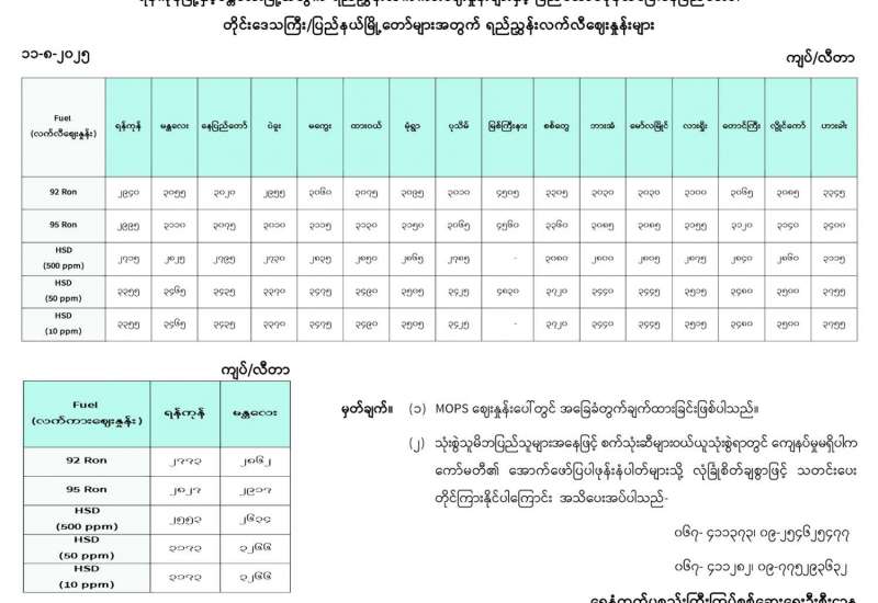 ရန်ကုန်မြို့နှင့် မန္တလေးမြို့အတွက် ရည်ညွှန်းလက်ကားဈေးနှုန်းများနှင့် ပြည်ထောင်စုနယ်မြေ နေပြည်တော်၊ တိုင်းဒေသကြီး/ပြည်နယ် မြို့တော်များအတွက် ရည်ညွှန်းလက်လီဈေးနှုန်းများ
