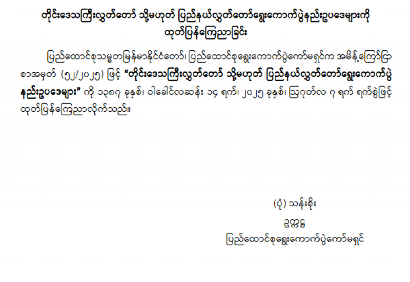 တိုင်းဒေသကြီးလွှတ်တော် သို့မဟုတ် ပြည်နယ်လွှတ်တော်ရွေးကောက်ပွဲနည်းဥပဒေများကို ထုတ်ပြန်ကြေညာခြင်း
