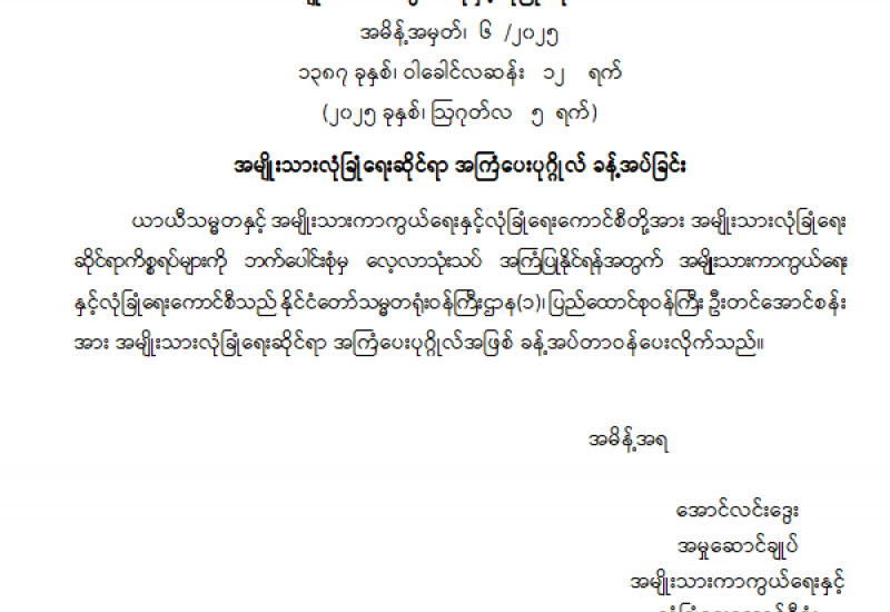 ရန်ကုန်မြို့နှင့် မန္တလေးမြို့အတွက် ရည်ညွှန်းလက်ကားဈေးနှုန်းများနှင့် ပြည်ထောင်စုနယ်မြေ နေပြည်တော်၊ တိုင်းဒေသကြီး/ပြည်နယ် မြို့တော်များအတွက် ရည်ညွှန်းလက်လီဈေးနှုန်းများ