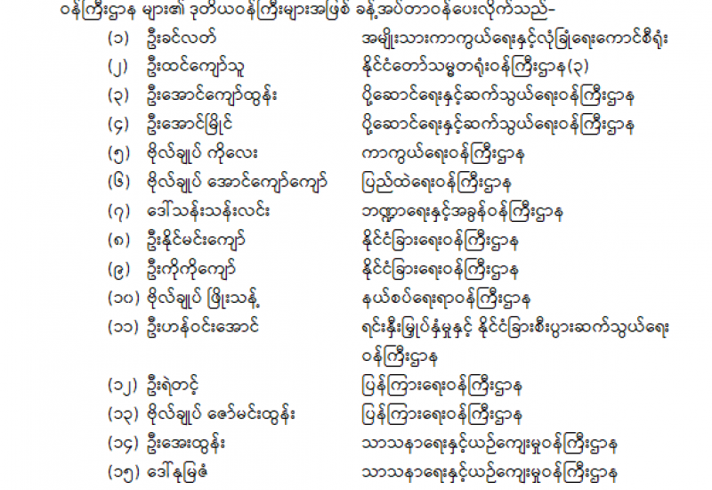 ပြည်ထောင်စုရာထူးဝန်အဖွဲ့ ဥက္ကဋ္ဌနှင့် အဖွဲ့ဝင်များ ခန့်အပ်တာဝန်ပေးခြင်း