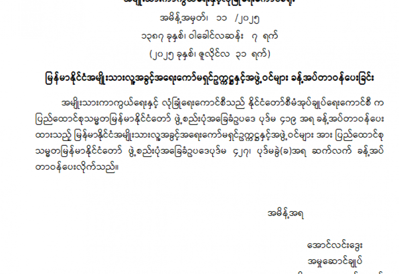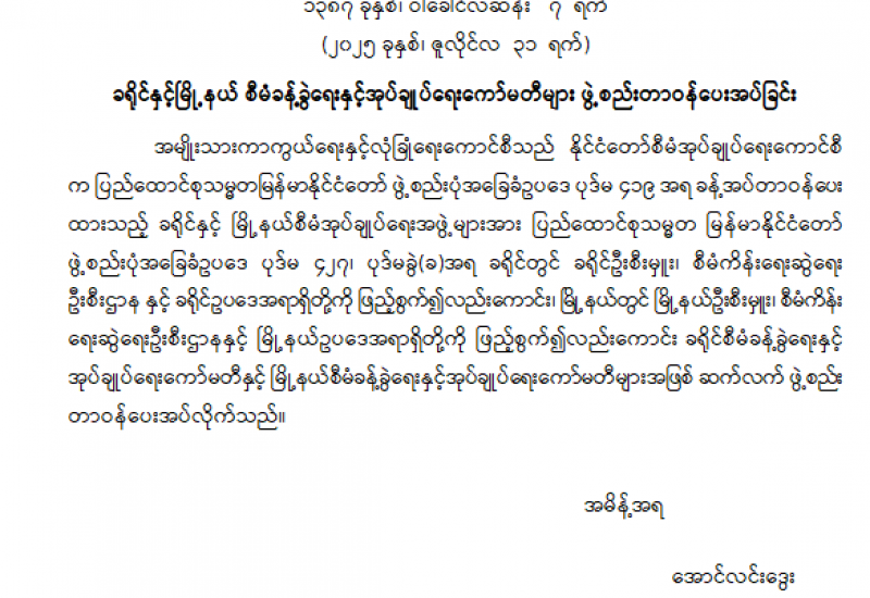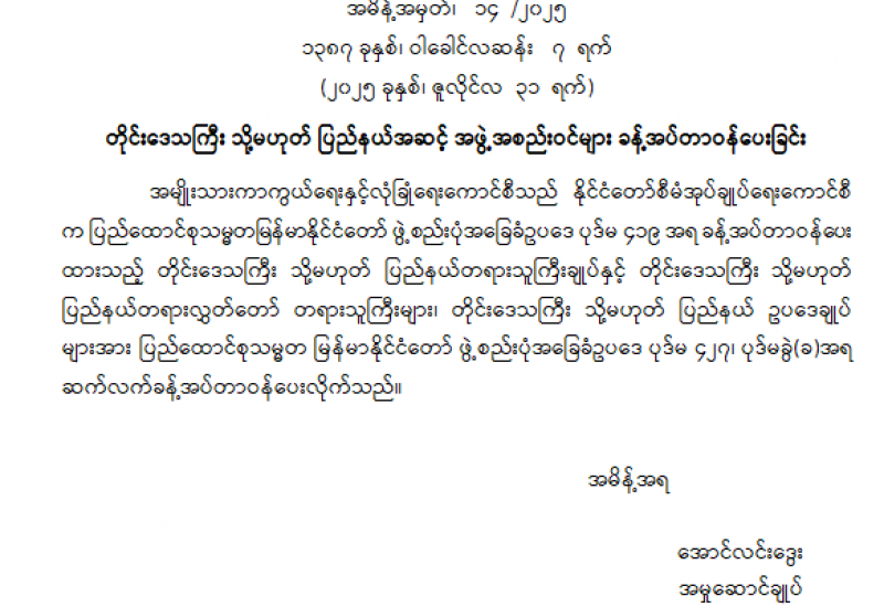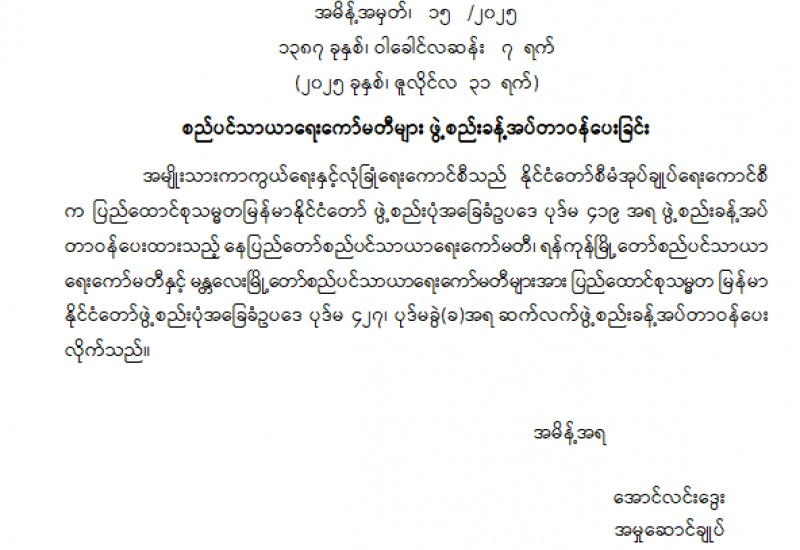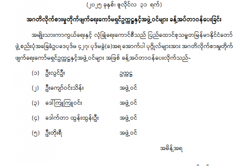 မြန်မာနိုင်ငံအမျိုးသားလူ့အခွင့်အရေးကော်မရှင်ဥက္ကဋ္ဌနှင့် အဖွဲ့ဝင်များ ခန့်အပ်တာဝန်ပေးခြင်း