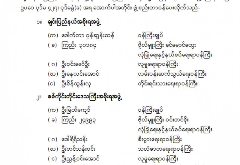 ဒုတိယဝန်ကြီးနှင့် ဒုတိယရှေ့နေချုပ် ခန့်အပ်တာဝန်ပေးခြင်း