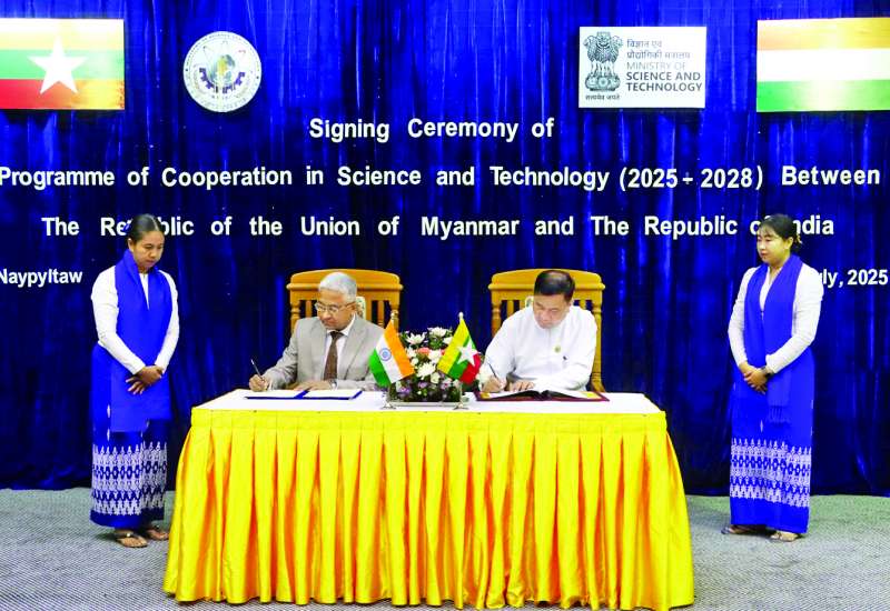 ၂၀၂၅ -၂၀၂၈ ခုနှစ် ကာလအတွက် ပြည်ထောင်စုသမ္မတ မြန်မာနိုင်ငံတော်နှင့် အိန္ဒိယသမ္မတနိုင်ငံတို့အကြား သိပ္ပံနှင့်နည်းပညာ ပူးပေါင်းဆောင်ရွက်မှုအစီအစဉ်- Programme of Cooperation (POC) in Science and Technology လက်မှတ်ရေးထိုးပွဲကို ယနေ့နံနက်ပိုင်းတွင် ရုံးအမှတ် (၂၁) သိပ္ပံနှင့် နည်းပညာဝန်ကြီးဌာန အစည်းအဝေးခန်းမ၌ ကျင်းပသည်။