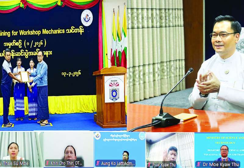 EV Mechanics (၁/၂၀၂၆) သင်တန်းဆင်းပွဲအခမ်းအနားကို ယနေ့မွန်းလွဲပိုင်းတွင် အစိုးရစက်မှုလက်မှုသိပ္ပံ(အင်းစိန်)၌ Hybrid စနစ်ဖြင့်ကျင်းပရာ လျှပ်စစ်သုံးယာဉ်နှင့် ဆက်စပ်ပစ္စည်းများ သုတေသနဖွံ့ဖြိုးရေးနှင့် နည်းပညာပြန့်ပွားရေးလုပ်ငန်းကော်မတီဥက္ကဋ္ဌ သိပ္ပံနှင့်နည်းပညာဝန်ကြီးဌာန ဒုတိယဝန်ကြီး ဒေါက်တာအောင်ဇေယျ၊ နည်းပညာ၊ သက်မွေးပညာနှင့် လေ့ကျင့်ရေးဦးစီးဌာန ညွှန်ကြားရေးမှူးချုပ်၊ ဒုတိယညွှန်ကြားရေးမှူးချုပ်များ၊ တာဝန်ရှိသူများက ဗီဒီယိုကွန်ဖရင့်ဖြင့် တက်ရောက်ကြသည်။