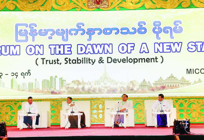 “မြန်မာ့မျက်နှာစာသစ်ဖိုရမ်” (ယုံကြည်မှု၊ တည်ငြိမ်အေးချမ်းမှုနှင့် ဖွံ့ဖြိုးတိုးတက်မှု) “Forum on The Dawn of A New State”(Trust, Stability & Development) ပထမနေ့ကို ယနေ့တွင် နေပြည်တော်ရှိ မြန်မာအပြည်ပြည်ဆိုင်ရာကွန်ဗင်းရှင်းဗဟိုဌာန (၁) (MICC I) ၌ ကျင်းပသည်။
