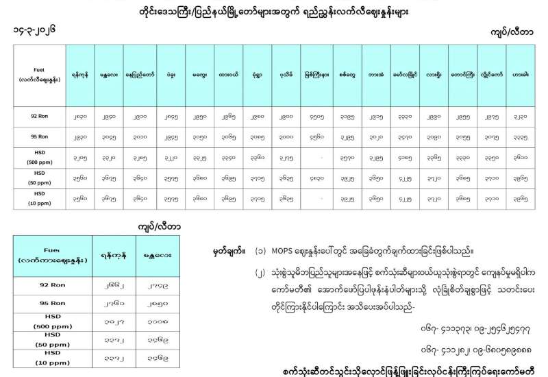 ရန်ကုန်မြို့နှင့် မန္တလေးမြို့အတွက် ရည်ညွှန်းလက်ကားဈေးနှုန်းများနှင့် ပြည်ထောင်စုနယ်မြေ နေပြည်တော်၊ တိုင်းဒေသကြီး/ပြည်နယ် မြို့တော်များအတွက် ရည်ညွှန်းလက်လီဈေးနှုန်းများ