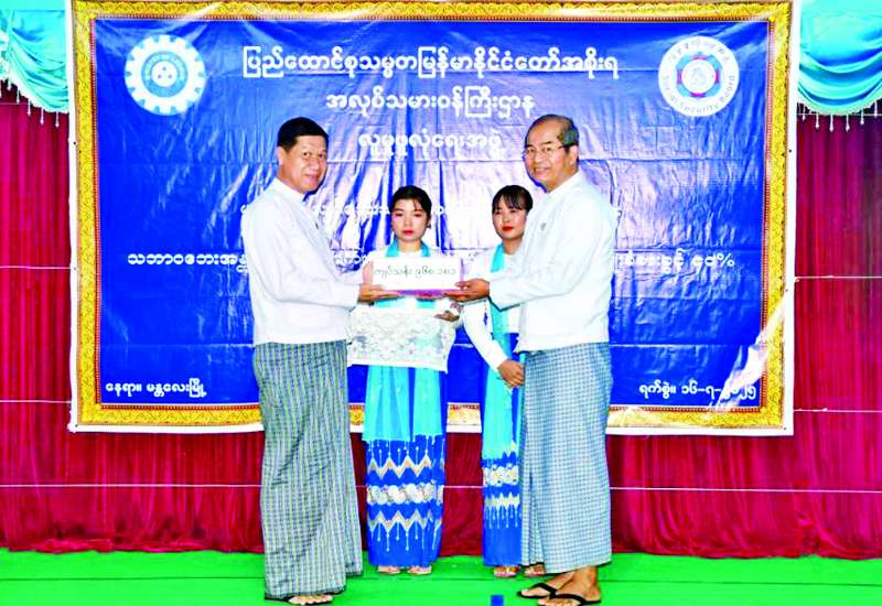 အလုပ်သမားဝန်ကြီးဌာန လူမှုဖူလုံရေးအဖွဲ့မှ မန္တလေးငလျင်ဘေးသင့် အာမခံအလုပ်သမားများအား သဘာဝဘေးအန္တရာယ်ကျရောက်မှုဆိုင်ရာ မိသားစုထောက်ပံ့မှုအကျိုးခံစားခွင့် ၄၀ ရာခိုင်နှုန်းနှင့် ကျန်ရစ်သူအကျိုးခံစားခွင့်ပေးအပ်ပွဲအခမ်းအနားကို ယနေ့နံနက်ပိုင်းက မန္တလေးတိုင်းဒေသကြီး လူမှုဝန်ထမ်းဦးစီးဌာနခန်းမ၌ ကျင်းပသည်။