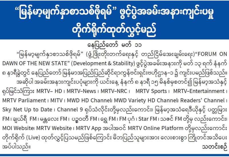 မြန်မာ့မျက်နှာစာသစ်ဖိုရမ်(ယုံကြည်မှု၊ တည်ငြိမ်အေးချမ်းမှုနှင့် ဖွံ့ဖြိုးတိုးတက်မှု) Forum on The Dawn of A New State (Trust, Stability & Development) ဖွင့်ပွဲအခမ်းအနားအား ယနေ့နံနက်ပိုင်းတွင် နေပြည်တော်ရှိ မြန်မာအပြည်ပြည်ဆိုင်ရာ ကွန်ဗင်းရှင်းဗဟိုဌာန(၁) (MICC-1) ၌ ကျင်းပပြုလုပ်ရာ ပြည်ထောင်စုသမ္မတမြန်မာနိုင်ငံတော် ယာယီသမ္မတ နိုင်ငံတော်လုံခြုံရေးနှင့် အေးချမ်းသာယာရေးကော်မရှင်ဥက္ကဋ္ဌ ဗိုလ်ချုပ်မှူးကြီး မင်းအောင်လှိုင် တက်ရောက်အမှာစကားပြောကြားသည်။