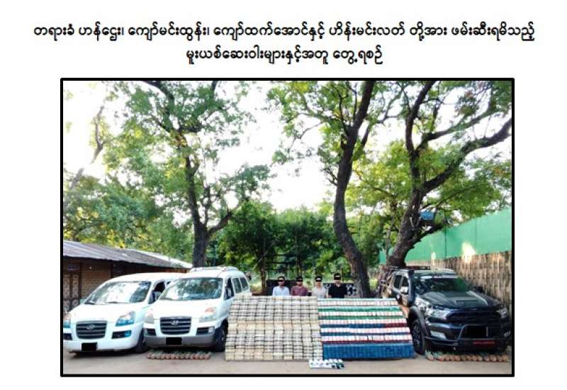 စစ်ကိုင်းတိုင်းဒေသကြီး၊ စစ်ကိုင်းမြို့နှင့် မန္တလေးတိုင်းဒေသကြီး၊ ချမ်းမြသာစည်မြို့နယ်တို့၌ ဇူလိုင် ၇ ရက်နှင့် ၈ ရက်တို့တွင် ငွေကျပ် ၂၀ ဒသမ ၂၂၅ ဘီလီယံတန်ဖိုးရှိ စိတ်ကြွရူးသွပ်ဆေးပြား ၉ သန်းကျော်နှင့် ဘိန်းဖြူ ၂၂ ကီလိုတို့ကို ဖမ်းဆီးရမိခဲ့ကြောင်း မြန်မာနိုင်ငံရဲတပ်ဖွဲ့မှ သိရှိရသည်။