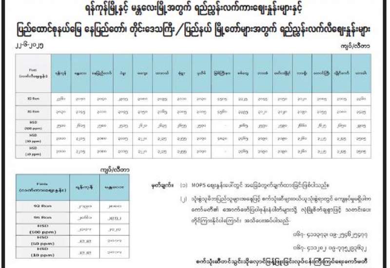 ရန်ကုန်မြို့နှင့် မန္တလေးမြို့အတွက် ရည်ညွှန်းလက်ကားဈေးနှုန်းများနှင့် ပြည်ထောင်စုနယ်မြေ နေပြည်တော်၊ တိုင်းဒေသကြီး/ ပြည်နယ် မြို့တော်များအတွက် ရည်ညွှန်းလက်လီဈေးနှုန်းများ