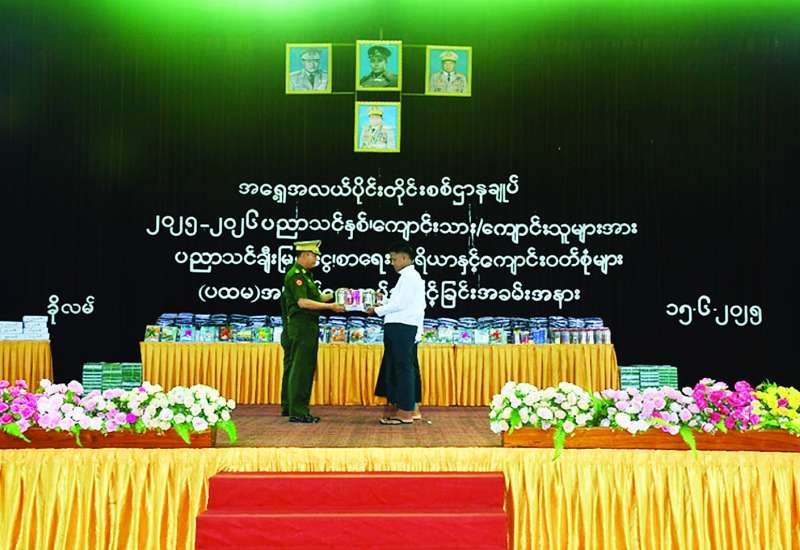 ၂၀၂၅-၂၀၂၆ ပညာသင်နှစ်တွင် တက်ရောက်ပညာသင်ကြားကြမည့် အရှေ့အလယ်ပိုင်းတိုင်းစစ်ဌာနချုပ် ခိုလမ်တပ်နယ်ရှိ တပ်မတော်သား မိသားစုဝင် ကျောင်းသား ကျောင်းသူများအတွက် (ပထမအကြိမ်) ကျောင်းဝတ်စုံ၊ စာရေးကိရိယာများနှင့် ပညာသင်စရိတ်များ ပေးအပ်ပွဲကို ယနေ့နံနက်ပိုင်းတွင် တိုင်းစစ်ဌာနချုပ် အောင်ဇေယျခန်းမ၌ပြုလုပ်ရာ တိုင်းမှူးဗိုလ်ချုပ်မျိုးမင်းထွန်းနှင့် အဖွဲ့ဝင်များ၊ အရာရှိ၊ စစ်သည်၊ မိသားစုဝင်များ၊ ဆရာ ဆရာမများ၊ ကျောင်းသားမိဘများနှင့် ကျောင်းသား ကျောင်းသူများ တက်ရောက်ကြသည်။