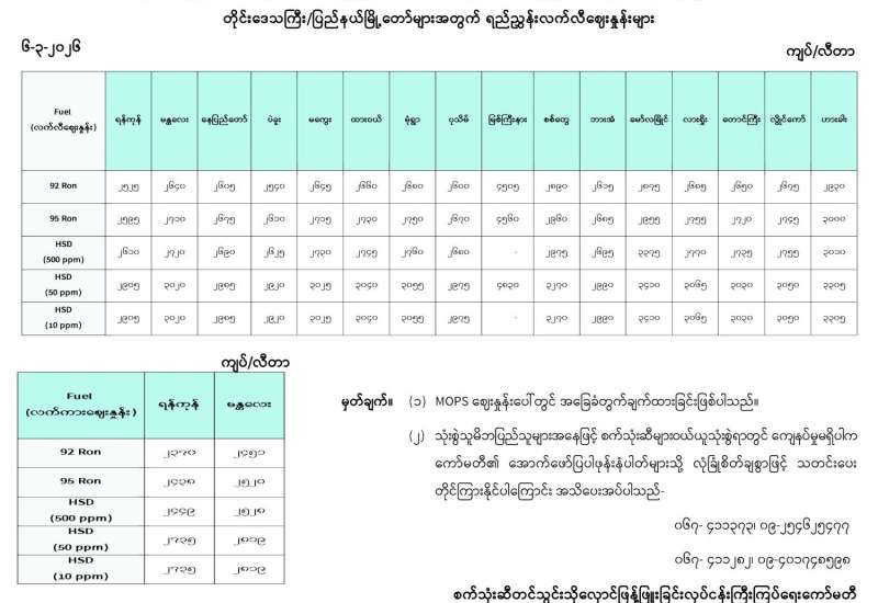 ရန်ကုန်မြို့နှင့် မန္တလေးမြို့အတွက် ရည်ညွှန်းလက်ကားဈေးနှုန်းများနှင့် ပြည်ထောင်စုနယ်မြေ နေပြည်တော်၊ တိုင်းဒေသကြီး/ပြည်နယ် မြို့တော်များအတွက် ရည်ညွှန်းလက်လီဈေးနှုန်းများ