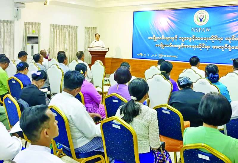 နိုင်ငံတော်သည် အမျိုးသမီးများ၏ အခန်းကဏ္ဍနှင့်စပ်လျဉ်း၍ အမျိုးသမီးများ ဖွံ့ဖြိုးတိုးတက်ရေးဆိုင်ရာ နိုင်ငံတော်အဆင့် မဟာဗျူဟာစီမံကိန်း NSPAW Phase II (၂၀၂၃-၂၀၃၂)ကို ဆောင်ရွက်လျက်ရှိရာ မဟာဗျူဟာစီမံကိန်း၏ အမျိုးသမီးအခွင့်အရေးနှင့် လူ့အခွင့်အရေး ကဏ္ဍရှိ လုပ်ငန်းများအကောင် အထည်ဖော်ဆောင်ရွက်နိုင်ရေးနှင့် ၂၀၂၆ ခုနှစ် မတ် ၈ ရက်တွင် ကျရောက်မည့် အပြည်ပြည်ဆိုင်ရာ အမျိုးသမီးများနေ့ကို ကြိုဆိုသည့်အနေဖြင့် အမျိုးသမီးအခွင့်အရေးများဆိုင်ရာ အလုပ်ရုံ ဆွေးနွေးပွဲကို ယနေ့နံနက်ပိုင်း တွင် မြန်မာနိုင်ငံအမျိုးသား လူ့အခွင့်အရေးကော်မရှင်ရုံး (ရန်ကုန်)၌ ကျင်းပရာ မြန်မာနိုင်ငံ အမျိုးသားလူ့အခွင့်အရေးကော်မရှင်ဥက္ကဋ္ဌ ဦးပေါ်လွင်စိန်နှင့် ကော်မရှင်အဖွဲ့ဝင်များ၊ အမျိုးသမီးများနှင့် လူ့အခွင့်အရေးဆိုင်ရာ လုပ်ငန်းကော်မတီဥက္ကဋ္ဌ၊ အတွင်းရေးမှူးနှင့် ဝန်ကြီးဌာနအဖွဲ့အစည်းများမှ လုပ်ငန်းကော်မတီဝင်များ တက်ရောက်ကြသည်။