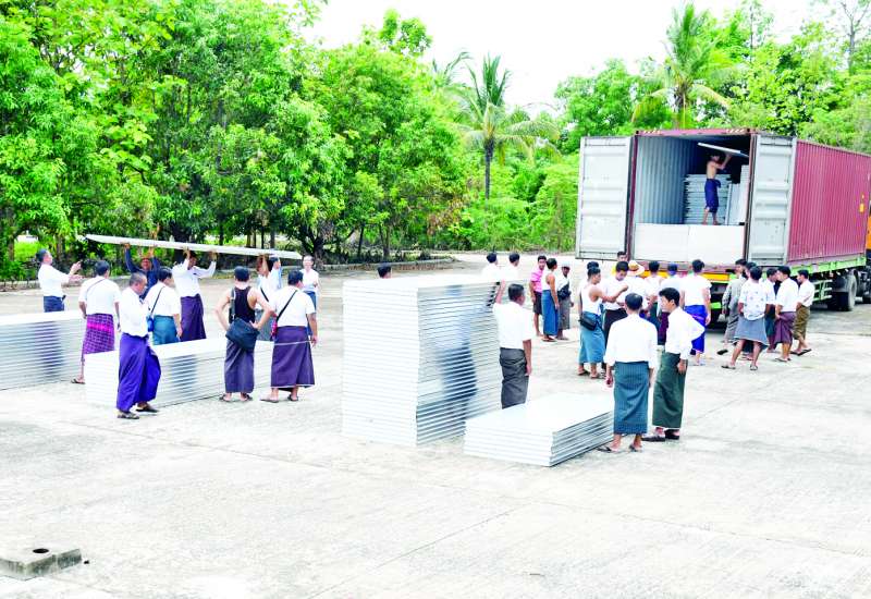 လျှပ်စစ်စွမ်းအားဝန်ကြီးဌာန ပြည်ထောင်စုဝန်ကြီး ဦးဉာဏ်ထွန်းသည် ဒုတိယဝန်ကြီး ဦးအေးကျော်နှင့်အတူ ယနေ့နံနက်ပိုင်းတွင် ဥတ္တရသီရိမြို့နယ်ရှိ နေပြည်တော်ဗဟိုသင်တန်းကျောင်းဝင်းအတွင်း ဝန်ကြီးဌာနမှ ငလျင်ဘေးသင့်ဝန်ထမ်းများနှင့် ဝန်ထမ်းမိသားစုများ ယာယီပြောင်းရွှေ့နေထိုင်နိုင်ရန်အတွက် Container House များ တည်ဆောက်နိုင်ရန်ပစ္စည်းများ ရောက်ရှိမှု၊ တပ်ဆင်တည်ဆောက်နေမှုအခြေအနေကို သွားရောက်ကြည့်ရှုစစ်ဆေးသည်။
