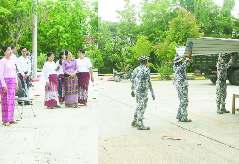 ပြည်ထောင်စုစာရင်းစစ်ချုပ် ဒေါက်တာခင်နိုင်ဦးသည် ဒုတိယစာရင်းစစ်ချုပ် ဒေါ်နိုင်သက်ဦးနှင့်အတူ ယနေ့နံနက်ပိုင်း၌ ပြည်ထောင်စုစာရင်းစစ်ချုပ်ရုံးဝင်းအတွင်းရှိ ပြည်ထောင်စုစာရင်းစစ်ချုပ်ရုံးမှ ငလျင်ဘေးသင့်ဝန်ထမ်းနှင့် မိသားစုဝင်များ ယာယီနေထိုင်နိုင်ရန်အတွက် အမျိုးသားသဘာဝဘေးအန္တရာယ်ဆိုင်ရာ စီမံခန့်ခွဲမှုကော်မတီက ခွဲဝေချထားပေးသည့် အိပ်ခန်းနှစ်ခန်းပါ Container House များကို တပ်မတော်သားများ၏ လုပ်အားဖြင့် နေရာချထားနေမှုအခြေအနေကို ကြည့်ရှုစစ်ဆေးသည်။
