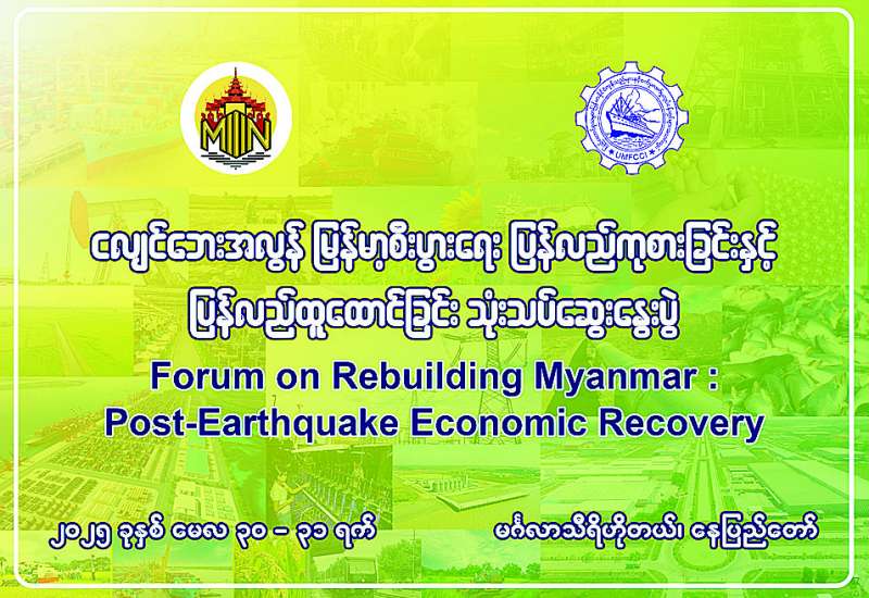 ပြန်ကြားရေးဝန်ကြီးဌာနနှင့် စီးပွားရေးနှင့်ကူးသန်းရောင်းဝယ်ရေးဝန်ကြီးဌာနတို့ ကြီးမှူး၍ မြန်မာ့ပုံရိပ် ဖော်ညွှန်းရေးအဖွဲ့ (Myanmar Narrative Think Tank) က စီစဉ်ကျင်းပသော “ငလျင်ဘေးအလွန် မြန်မာ့စီးပွားရေး ပြန်လည်ကုစားခြင်းနှင့် ပြန်လည်ထူထောင်ခြင်း” (Forum on Rebuilding Myanmar: Post-Earthquake Economic Recovery) သုံးသပ်ဆွေးနွေးပွဲကို မေ ၃၀ ရက်နှင့် ၃၁ ရက်တို့တွင် နေပြည်တော်ရှိ မင်္ဂလာသီရိဟိုတယ်၌ ကျင်းပမည်ဖြစ်သည်။