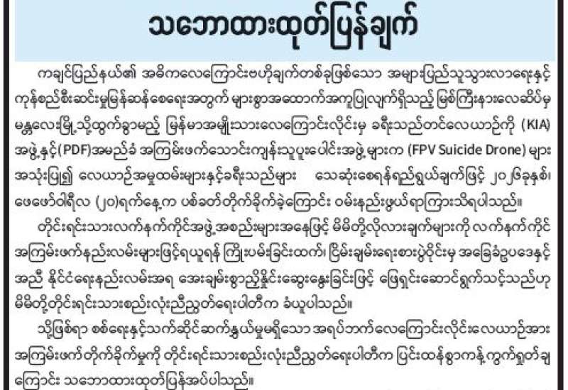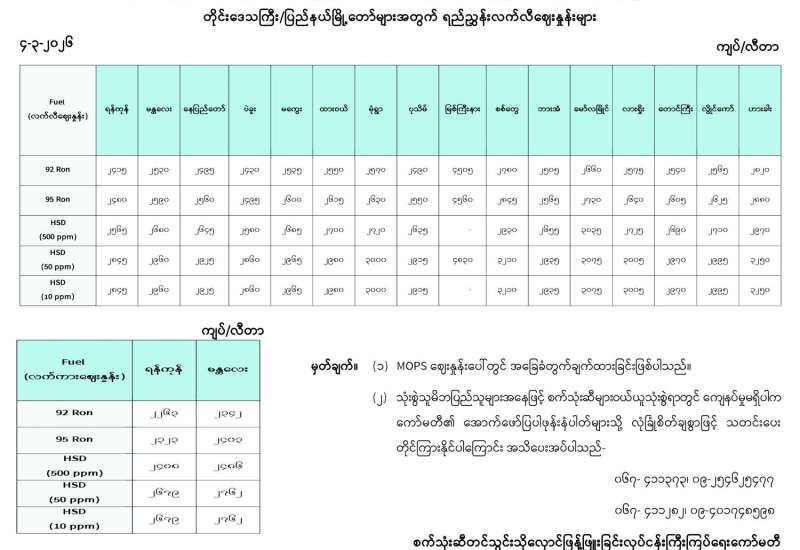 စက်သုံးဆီ ခြိုးခြံချွေတာသုံးစွဲရေးအတွက် ပြည်သူသို့ အသိပေးကြေညာချက်အား ဖြည့်စွက်ထုတ်ပြန်ခြင်း