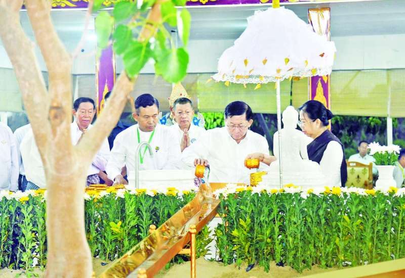 ဗုဒ္ဓဘာသာမြန်မာလူမျိုးတို့၏ ၁၂ လရာသီပွဲတော်တွင် တစ်ခုအပါအဝင်ဖြစ်သည့် မြန်မာသက္ကရာဇ် ၁၃၈၇ ခုနှစ်၊ ကဆုန်လပြည့်(ဗုဒ္ဓနေ့)ဖြစ်သော ယနေ့တွင် ကျရောက်သည့် ကဆုန်ညောင်ရေ သွန်းပွဲတော်တွင်ပြည်ထောင်စုနယ်မြေ နေပြည်တော် မာရဝိဇယဗုဒ္ဓဥယျာဉ် ပရိဝုဏ်တော်အတွင်းရှိ မဟာဗောဓိညောင်ပင်တော်အား ကဆုန်ညောင်ရေသွန်းလောင်းပူဇော်ခြင်း မင်္ဂလာအခမ်းအနားကို ယနေ့ညနေပိုင်းက ကျင်းပပြုလုပ်ရာ နိုင်ငံတော်စီမံအုပ်ချုပ်ရေးကောင်စီဥက္ကဋ္ဌ နိုင်ငံတော်ဝန်ကြီးချုပ် ဗိုလ်ချုပ်မှူးကြီးမင်းအောင်လှိုင်နှင့်ဇနီး ဒေါ်ကြူကြူလှတို့က မဟာဗောဓိညောင်ပင်တော်ကို ညောင်ရေသွန်းလောင်းပူဇော်ကြသည်။