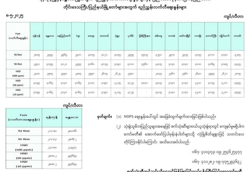 ရန်ကုန်မြို့နှင့် မန္တလေးမြို့အတွက် ရည်ညွှန်းလက်ကားဈေးနှုန်းများနှင့် ပြည်ထောင်စုနယ်မြေ နေပြည်တော်၊ တိုင်းဒေသကြီး/ပြည်နယ် မြို့တော်များအတွက် ရည်ညွှန်းလက်လီဈေးနှုန်းများ