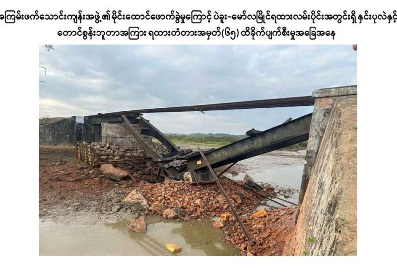 ပဲခူး-မော်လမြိုင် ရထားလမ်းပိုင်းအတွင်းရှိ မွန်ပြည်နယ်၊ ဘီးလင်းမြို့နယ်၊ နှင်းပုလဲဘူတာနှင့် တောင်စွန်းဘူတာအကြား၊ မိုင်တိုင်အမှတ် ၁၁၂/၁၀-၁၁ ရှိ အရှည်ပေ ၆၀ ရှိသော ရထားတံတားအမှတ် (၆၅)အောက်၌ မေ ၅ ရက် ည ၁၁ နာရီ ၁၅ မိနစ်အချိန်ခန့်တွင် အကြမ်းဖက်သောင်းကျန်းသူအဖွဲ့က ထောင်ထားသည့် မိုင်းပေါက်ကွဲမှုကြောင့် ရထားတံတားထိခိုက်ပျက်စီးနေကြောင်း သိရှိရသဖြင့် နှင်းပုလဲနှင့် တောင်စွန်းရထားလမ်းပိုင်းအား ယာယီပိတ်ထားကြောင်း မြန်မာ့မီးရထားမှ သိရှိရသည်။