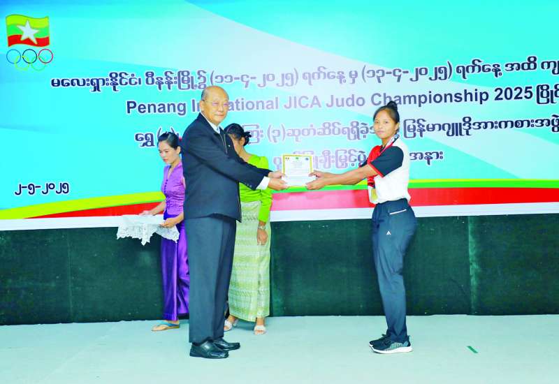 ၂၀၂၅ ခုနှစ် ဧပြီ ၁၁ ရက်မှ ၁၃ ရက်အထိ မလေးရှားနိုင်ငံ ပီနန်းမြို့တွင် ကျင်းပခဲ့သည့် PENANG INVITATIONAL JICA JUDO CHAMPIONSHIP 2025 ပြိုင်ပွဲတွင် အောင်မြင်မှုဆုတံဆိပ်များရရှိခဲ့သည့် မြန်မာဂျူဒိုအားကစားအဖွဲ့အား ဂုဏ်ပြုချီးမြှင့်ပွဲအခမ်းအနားကို ယမန်နေ့ညနေပိုင်းတွင် နေပြည်တော်အားကစားလေ့ကျင့်ရေးစခန်း (Gold Camp)ရှိ ဘက်စုံသုံးခန်းမ၌ ကျင်းပသည်။