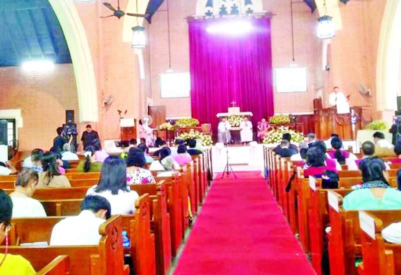 မြန်မာနိုင်ငံခရစ်ယာန်ဂိုဏ်းပေါင်းစုံ ငြိမ်းချမ်းရေးအထောက်အကူပြု ဗဟိုကော်မတီကကြီးမှူး ကျင်းပသည့် ငလျင်ဒဏ်နှင့် သဘာဝဘေးအန္တရာယ် သင့်ပြည်သူများနှင့် ငြိမ်းချမ်းရေးအတွက် ဆုတောင်းခြင်းအစီအစဉ်ကို ယနေ့မွန်းလွဲပိုင်းက ရန်ကုန်မြို့ ဒဂုံမြို့နယ် အလံပြဘုရားလမ်းရှိ မက်သဒစ်အင်္ဂလိပ်အသင်းတော် ဘုရားရှိခိုးကျောင်း၌ ကျင်းပသည်။
