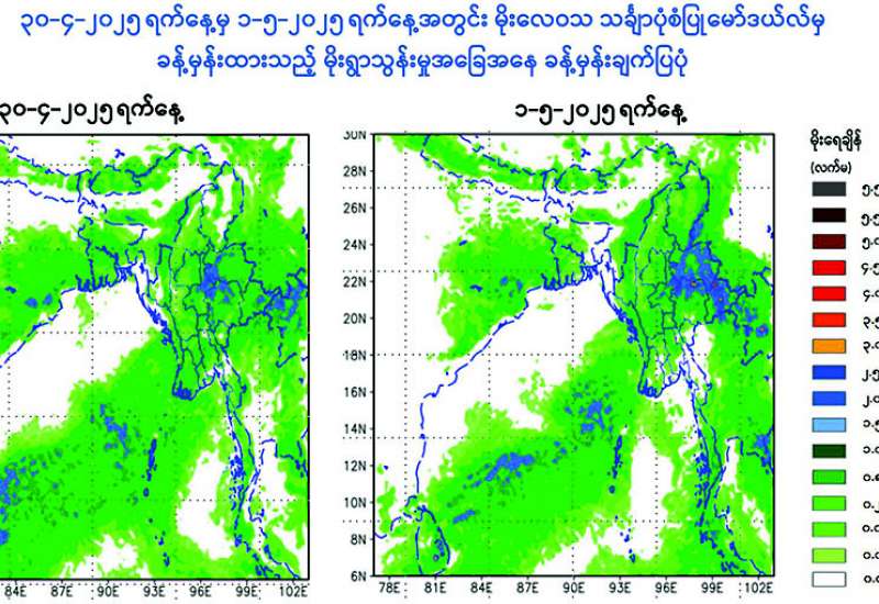 ယနေ့ညနေ ၅ နာရီခွဲ တိုင်းထွာချက်များအရ အနောက်ဘက်မှ ရွေ့လျားလာသော လေပွေလှိုင်းများ၏ အရှိန်ကြောင့်လည်းကောင်း၊ အရှေ့ဘက်မှ ရွေ့လျားလာသော လေပွေလှိုင်းများ၏ အရှိန်ကြောင့်လည်းကောင်း၊ ကပ္ပလီပင်လယ်ပြင်နှင့် ဘင်္ဂလားပင်လယ်အော်တို့မှ လေနွေးများနှင့် တရုတ်ပြည်မကြီးပေါ်ရှိ လေဖိအားကြီးရပ်ဝန်းဒေသမှ ရွေ့လျားလာသော လေအေးများတွေ့ဆုံမှုကြောင့်လည်းကောင်း၊ အပူပြန်တက်တိမ်များ ဖြစ်ထွန်းမှု အားကောင်းခြင်းကြောင့်လည်းကောင်း ယနေ့ညနေမှ မေ ၄ ရက်အတွင်း နေပြည်တော်၊ ရန်ကုန်တိုင်းဒေသကြီး၊ မန္တလေးတိုင်းဒေသကြီး၊ ပဲခူးတိုင်းဒေသ ကြီး၊ မကွေးတိုင်းဒေသကြီး၊ စစ်ကိုင်းတိုင်းဒေသကြီး၊ ဧရာဝတီတိုင်းဒေသကြီး၊ တနင်္သာရီတိုင်းဒေသကြီး၊ ကချင်ပြည်နယ်၊ ကယားပြည်နယ်၊ ကရင်ပြည်နယ်၊ ချင်းပြည်နယ်၊ မွန်ပြည်နယ်၊ ရခိုင်ပြည်နယ်နှင့် ရှမ်းပြည်နယ်တို့တွင် နေရာစိပ်စိပ်မှ နေရာအနှံ့အပြား မိုးထစ်ချုန်းရွာပြီး အချို့ဒေသများတွင် ဒေသအလိုက်နှင့် နေရာကွက်၍ မိုးကြီးနိုင်သည်။