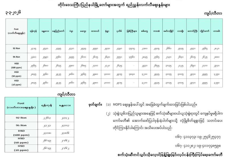ရန်ကုန်မြို့နှင့် မန္တလေးမြို့အတွက် ရည်ညွှန်းလက်ကားဈေးနှုန်းများနှင့် ပြည်ထောင်စုနယ်မြေ နေပြည်တော်၊ တိုင်းဒေသကြီး/ပြည်နယ် မြို့တော်များအတွက် ရည်ညွှန်းလက်လီဈေးနှုန်းများ