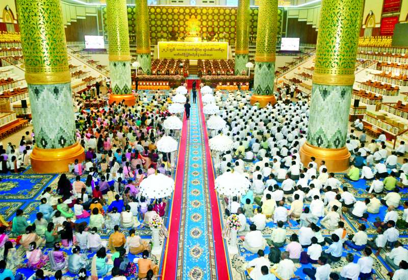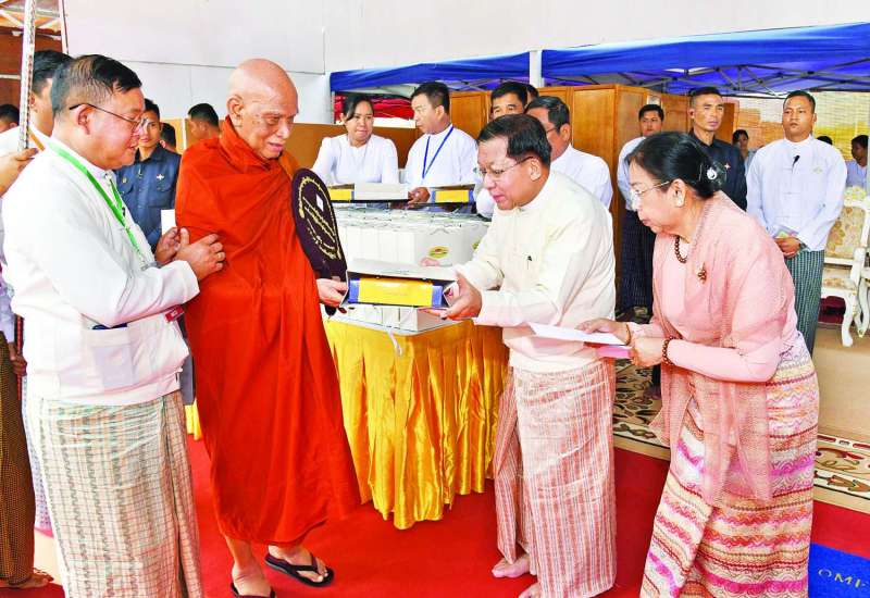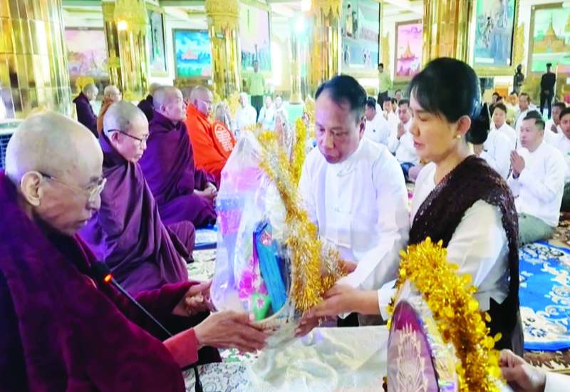 ၂၀၂၆ ခုနှစ် သာသနာတော်ဆိုင်ရာ ဘွဲ့တံဆိပ်တော်များ ဆက်ကပ်ပူဇော်ခြင်း မဟာမင်္ဂလာအခမ်းအနားနှင့် ဆွမ်းဆန်စိမ်းလောင်းလှူပွဲအခမ်းအနားကို ယနေ့မွန်းလွဲပိုင်းတွင် နေပြည်တော်၊ မာရဝိဇယဗုဒ္ဓဥယျာဉ်တော် ပရိဝုဏ်အတွင်းရှိ အဂ္ဂါဓိပတိသာသနာ့ဗိမာန်တော်ကြီးအတွင်း၌ ဆင်ယင်ကျင်းပရာ ပြည်ထောင်စုသမ္မတမြန်မာ နိုင်ငံတော်ယာယီသမ္မတ နိုင်ငံတော်လုံခြုံရေးနှင့်အေးချမ်းသာယာရေးကော်မရှင်ဥက္ကဋ္ဌ ဗိုလ်ချုပ်မှူးကြီး မင်းအောင်လှိုင်နှင့်ဇနီး ဒေါ်ကြူကြူလှတို့ တက်ရောက်ကြည်ညို၍ သာသနာတော်ဆိုင်ရာဘွဲ့တံဆိပ်တော်များ ဆက်ကပ်ပူဇော်ပြီး ဆွမ်းဆန်စိမ်းများနှင့် လှူဖွယ်ဝတ္ထုပစ္စည်းများ လောင်းလှူကြသည်။