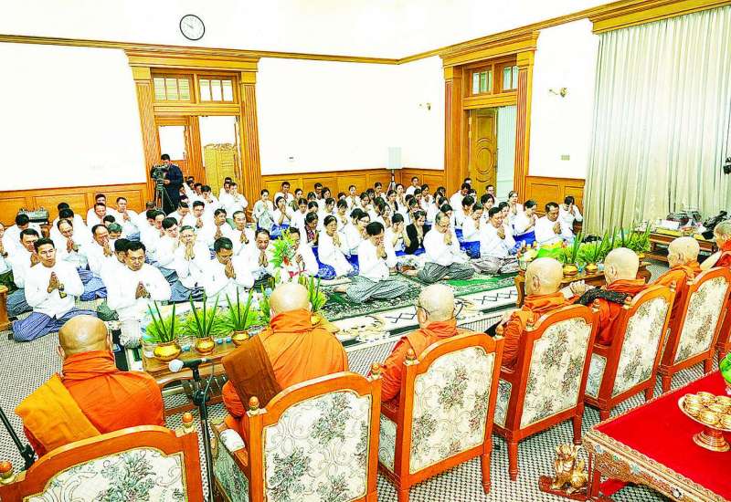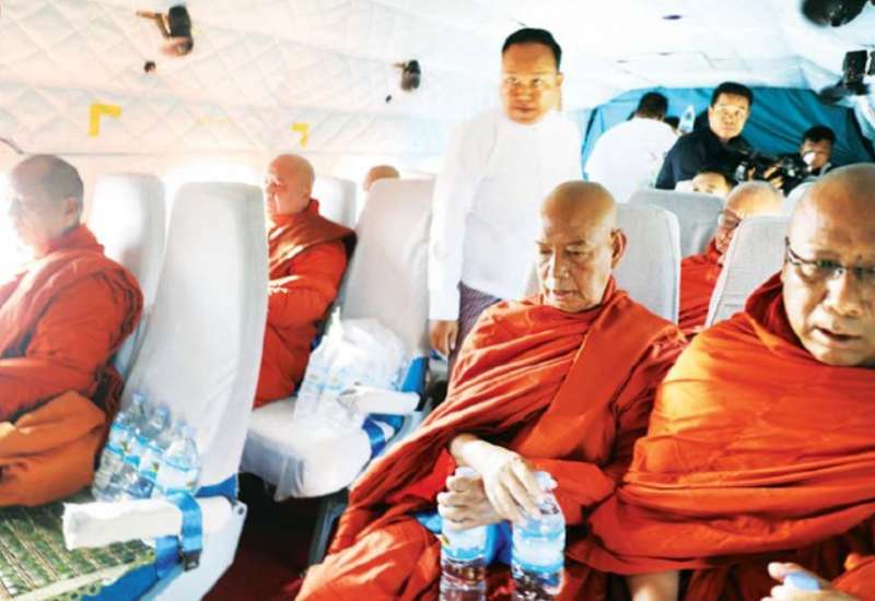 ပြည်သူများ ဘေးအန္တရာယ်အပေါင်း ကင်းရှင်းပြီး ငြိမ်းချမ်းသာယာစေရေးအတွက် ယနေ့နံနက် ၇ နာရီတွင် ဆရာတော်ကြီးများက ပြည်ထောင်စုနယ်မြေ နေပြည်တော်ဝေဟင်၌ ရဟတ်ယာဉ်ဖြင့် အန္တရာယ်ကင်းပရိတ်တရားတော်များရွတ်ဖတ်ပြီး ပရိတ်ရေများ ပက်ဖျန်းတော်မူကြသည်။
