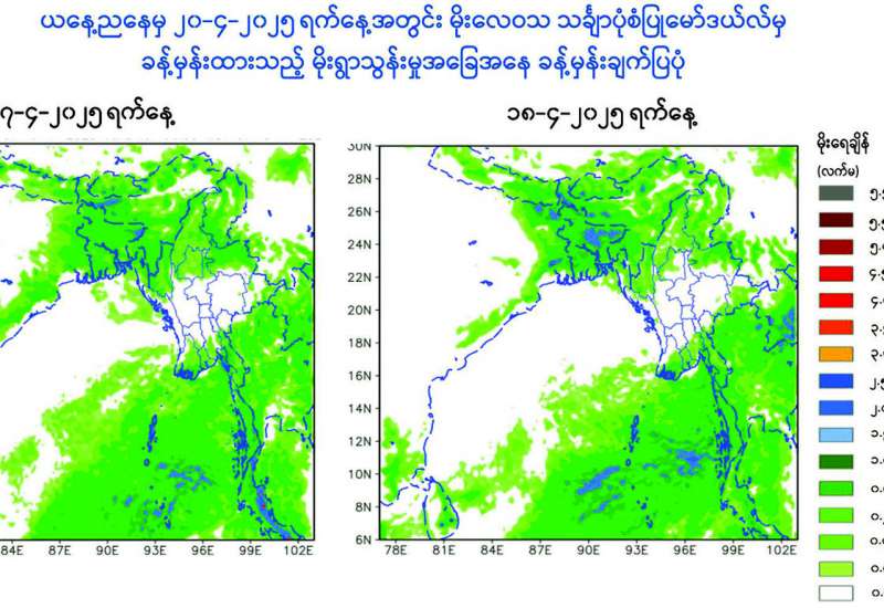 ယနေ့ ညနေ ၅ နာရီခွဲ တိုင်းထွာချက်များအရ အနောက်ဘက်မှ ရွေ့လျားလာသော လေပွေလှိုင်းများ၏ အရှိန်ကြောင့်လည်းကောင်း၊ အရှေ့ဘက်မှ ရွေ့လျားလာသော လေပွေလှိုင်းများ၏ အရှိန်ကြောင့်လည်းကောင်း၊ အပူပြန်တက်တိမ်များ ဖြစ်ထွန်းမှုအားကောင်းခြင်းကြောင့်လည်းကောင်း ယနေ့ညနေမှ ဧပြီ ၂၀ ရက်နေ့အတွင်း နေပြည်တော်၊ မန္တလေးတိုင်းဒေသကြီး၊ ပဲခူးတိုင်းဒေသကြီး၊ မကွေးတိုင်းဒေသကြီး၊ ရခိုင်ပြည်နယ်နှင့် ရှမ်းပြည်နယ်တို့တွင် နေရာကွက်ကျားမှ နေရာကျဲကျဲနှင့် ရန်ကုန်တိုင်းဒေသကြီး၊ စစ်ကိုင်းတိုင်းဒေသကြီး၊ ဧရာဝတီတိုင်းဒေသကြီး၊ တနင်္သာရီတိုင်းဒေသကြီး၊ ကချင်ပြည်နယ်၊ ကယားပြည်နယ်၊ ကရင်ပြည်နယ်၊ ချင်းပြည်နယ်နှင့် မွန်ပြည်နယ်တို့တွင် နေရာစိပ်စိပ်မှ နေရာအနှံ့အပြားမိုးထစ်ချုန်းရွာကာ အချို့ဒေသများတွင် နေရာကွက်၍ မိုးကြီးနိုင်သည်။
