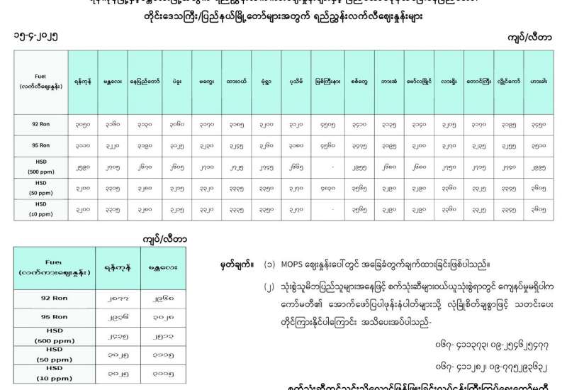 ရန်ကုန်မြို့နှင့် မန္တလေးမြို့အတွက် ရည်ညွန်းလက်ကားဈေးနှုန်းများ ပြည်ထောင်စုနယ်မြေ နေပြည်တော်၊ တိုင်းဒေသကြီး/ ပြည်နယ်မြို့တော်များအတွက် ရည်ညွှန်းလက်လီဈေးနှုန်းများ