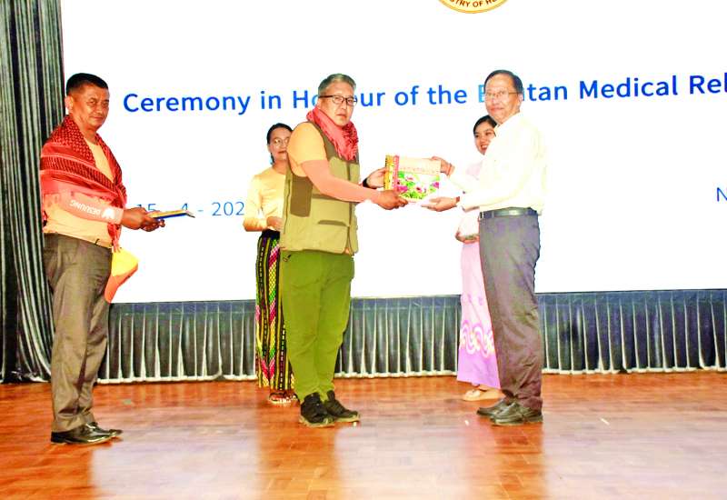 ကျန်းမာရေးဝန်ကြီးဌာန ပြည်ထောင်စုဝန်ကြီး ဒေါက်တာသက်ခိုင်ဝင်းသည် အမျိုးသားသဘာဝ ဘေးအန္တရာယ်ဆိုင်ရာ စီမံခန့်ခွဲမှုကော်မတီဥက္ကဋ္ဌကိုယ်စား တာဝန်ပြီးဆုံး၍ ပြန်လည်ထွက်ခွာမည့် ဘူတန်အရေးပေါ်ဆေးအဖွဲ့အား ဂုဏ်ပြုနှုတ်ဆက်ပွဲအခမ်းအနားကို ယနေ့နံနက်ပိုင်းတွင် ကျန်းမာရေး ဝန်ကြီးဌာန အစည်းအဝေးခန်းမ၌ ကျင်းပသည်။