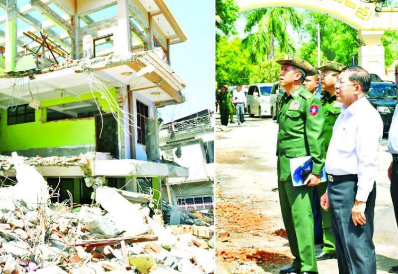 နိုင်ငံတော်စီမံအုပ်ချုပ်ရေးကောင်စီဥက္ကဋ္ဌ နိုင်ငံတော်ဝန်ကြီးချုပ် ဗိုလ်ချုပ်မှူးကြီးမင်းအောင်လှိုင်သည် ကောင်စီဝင်အဖွဲ့ဝင်များ၊ ပြည်ထောင်စုဝန်ကြီးများ၊ ကာကွယ်ရေးဦးစီးချုပ်ရုံးမှ အဆင့်မြင့် တပ်မတော်အရာရှိကြီးများနှင့် မန္တလေးတိုင်းဒေသကြီးဝန်ကြီးချုပ် ဦးမျိုးအောင်၊ အလယ်ပိုင်းတိုင်းစစ်ဌာနချုပ်တိုင်းမှူးနှင့် တာဝန်ရှိသူများ လိုက်ပါ၍ ယနေ့နံနက်ပိုင်းတွင် မန္တလေးတိုင်းဒေသကြီး ကျောက်ဆည်မြို့အတွင်း ငလျင်ဘေးဒဏ်ကြောင့် ထိခိုက်ပျက်စီးခဲ့သည့်အခြေအနေများနှင့် ပြန်လည်ထူထောင်ရေးလုပ်ငန်းများ ဆောင်ရွက်နေမှုအခြေအနေများကို သွားရောက်ကြည့်ရှုစစ်ဆေးသည်။