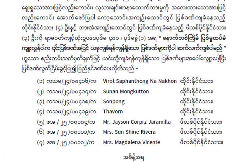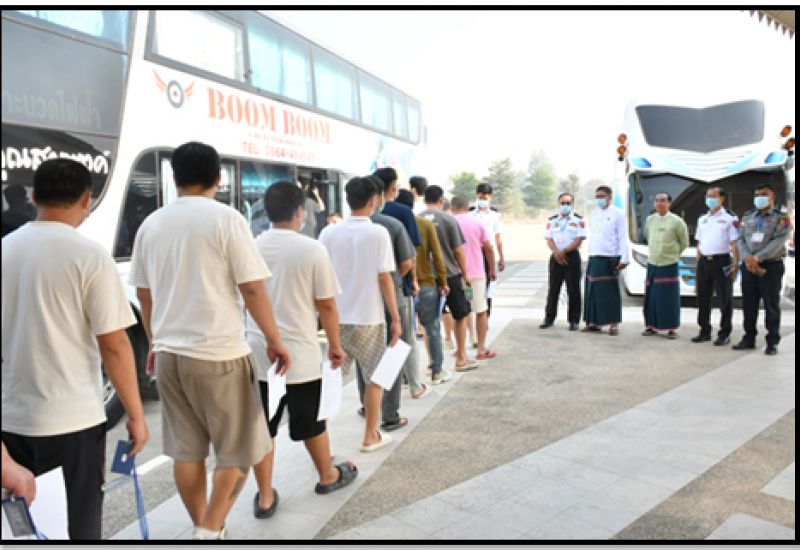 မြန်မာ - တရုတ် - ထိုင်း သုံးနိုင်ငံအကြား သုံးပွင့်ဆိုင်ပူးပေါင်းဆောင်ရွက်မှုပုံစံ (Trilateral Cooperation) ဖြင့် အွန်လိုင်းအသုံးပြုလိမ်လည်မှု (Online Scam) နှင့် အွန်လိုင်းလောင်းကစားမှု (Online Gambling) လုပ်ဆောင်နေကြသူများ၊ ပါဝင်ပတ်သက်သူများနှင့် နောက်ကွယ်မှကြိုးကိုင်သော ပြည်ပနိုင်ငံသားများကို ပြတ်ပြတ်သားသား စုံစမ်းဖော်ထုတ်တိုက်ဖျက်လျက်ရှိရာ ယနေ့တွင် အဆိုပါလုပ်ငန်းများ၌ ဆက်စပ်ပါဝင်ခဲ့ကြသည့် တရုတ်နိုင်ငံသား ၃၆၅ ဦးကို မြန်မာ - ထိုင်း အမှတ်(၂) ချစ်ကြည်ရေးတံတားမှတစ်ဆင့် သက်ဆိုင်ရာနိုင်ငံသို့ လူသားချင်းစာနာထောက်ထားမှုနှင့် နိုင်ငံအချင်းချင်း ချစ်ကြည်ရင်းနှီးမှုတို့ကို ရှေးရှု၍ ဥပဒေလုပ်ထုံးလုပ်နည်းများနှင့်အညီ ထပ်မံပြည်နှင်လွှဲပြောင်းပေးသည်။