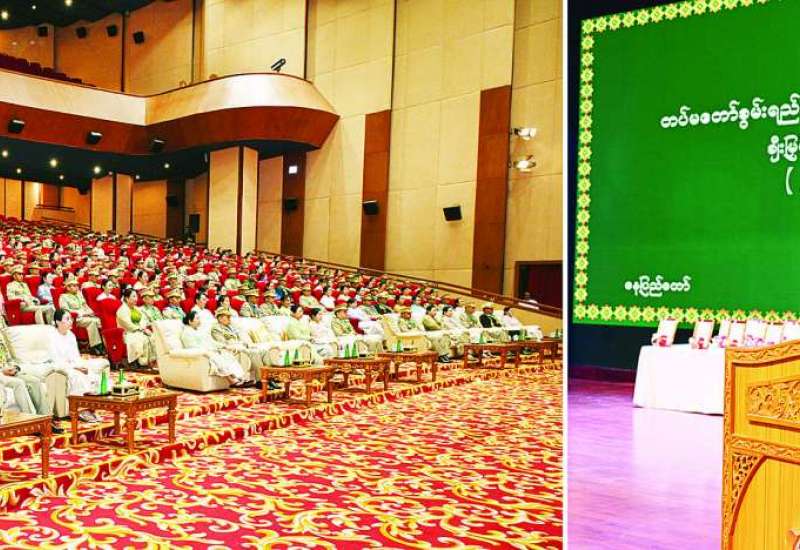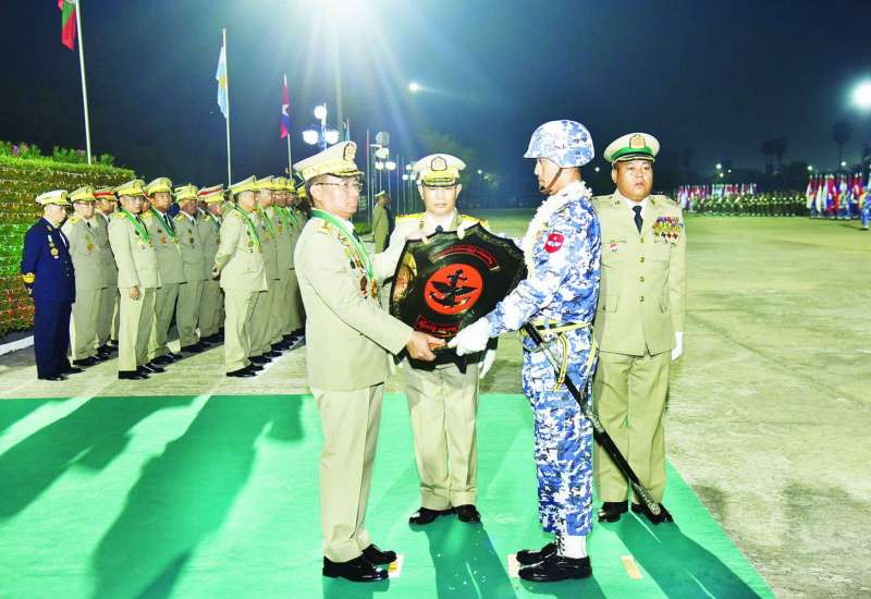 တပ်မတော်စွမ်းရည်သတ္တိဆိုင်ရာ ဂုဏ်ထူးဆောင်တံဆိပ်များ ချီးမြှင့်အပ်နှင်းခြင်းအခမ်းအနားကို ယနေ့မွန်းလွဲပိုင်းတွင် နေပြည်တော်ရှိ ဇေယျာသီရိဗိမာန်၌ ကျင်းပပြုလုပ်ရာ နိုင်ငံတော်စီမံအုပ်ချုပ်ရေးကောင်စီဥက္ကဋ္ဌ တပ်မတော်ကာကွယ်ရေးဦးစီးချုပ် ဗိုလ်ချုပ်မှူးကြီး သတိုးမဟာသရေစည်သူ သတိုးသီရိသုဓမ္မ မင်းအောင်လှိုင် တက်ရောက်မိန့်ခွန်းပြောကြားပြီး ဂုဏ်ထူးဆောင်တံဆိပ်များကို ချီးမြှင့်အပ်နှင်းပေးသည်။