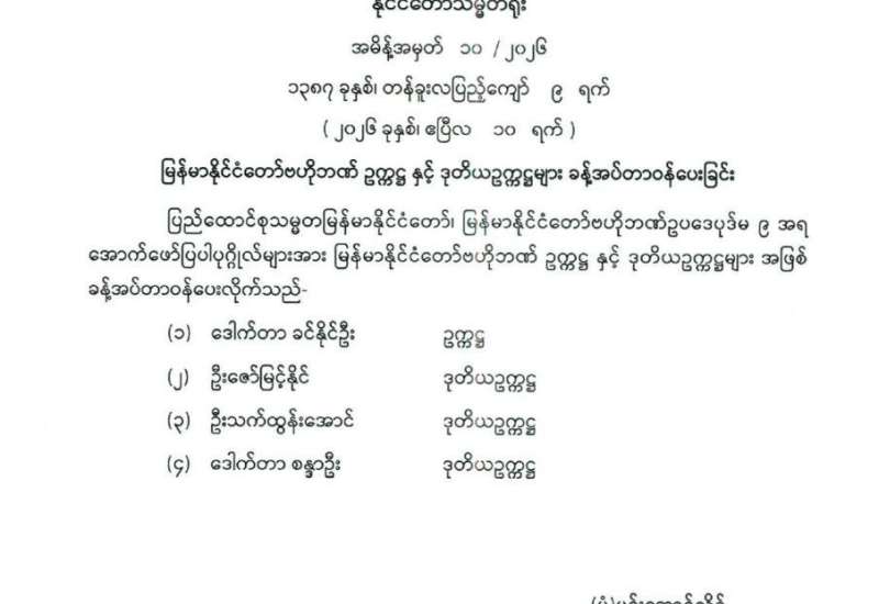 မြန်မာနိုင်ငံတော်ဗဟိုဘဏ်ဥက္ကဋ္ဌနှင့် ဒုတိယဥက္ကဋ္ဌများ ခန့်အပ်တာဝန်ပေးခြင်း