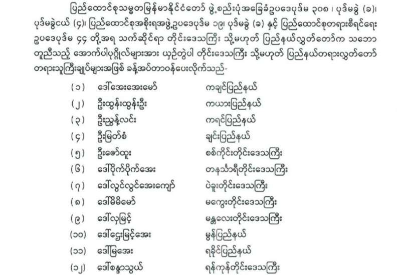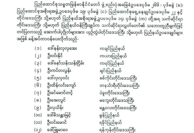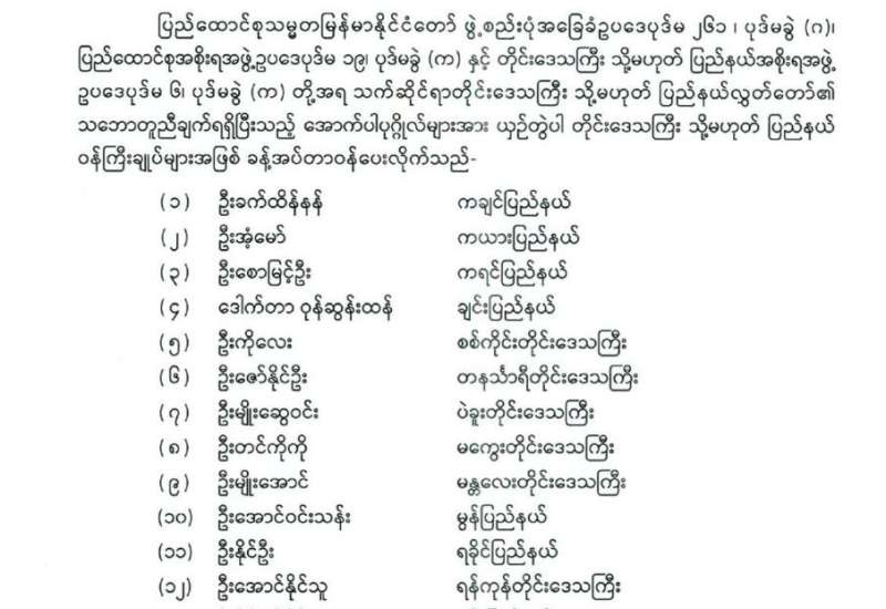 တိုင်းဒေသကြီး သို့မဟုတ် ပြည်နယ်ဝန်ကြီးချုပ်များ ခန့်အပ်တာဝန်ပေးခြင်း