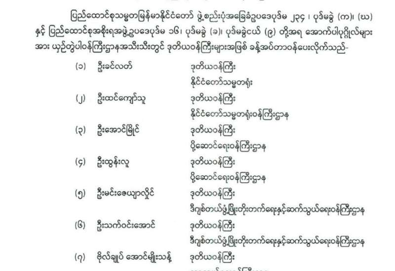 ပြည်ထောင်စုရာထူးဝန်အဖွဲ့ အဖွဲ့ဝင်များ ခန့်အပ်တာဝန်ပေးခြင်း