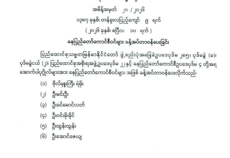 နေပြည်တော်ကောင်စီဝင်များ ခန့်အပ်တာဝန်ပေးခြင်း