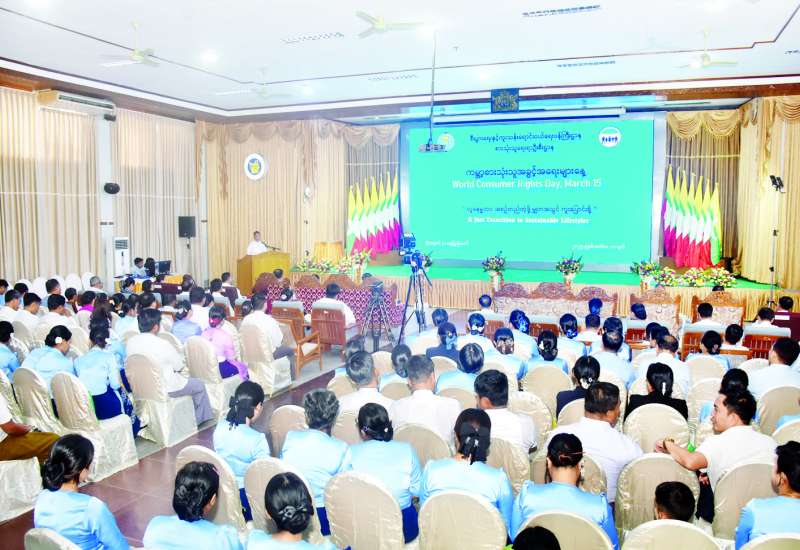 စီးပွားရေးနှင့်ကူးသန်းရောင်းဝယ်ရေးဝန်ကြီးဌာန စားသုံးသူရေးရာဦးစီးဌာန ရန်ကုန်တိုင်းဒေသကြီး ဦးစီးမှူးရုံးကကြီးမှူးကျင်းပသည့် ၂၀၂၅ ခုနှစ် ကမ္ဘာ့စားသုံးသူအခွင့်အရေးများနေ့ (World Consumer Rights Day) အခမ်းအနားကို “လူနေမှုဘဝ အစဉ်တည်တံ့ဖို့ မျှတအသွင် ကူးပြောင်းစို့” ဆောင်ပုဒ်နှင့်အညီ ယနေ့နံနက် ၁၀ နာရီတွင် ရန်ကုန်မြို့ မြန်မာနိုင်ငံကုန်သည်များနှင့် စက်မှုလက်မှုလုပ်ငန်းရှင်များ အသင်းချုပ်မင်္ဂလာခန်းမ၌ ကျင်းပသည်။