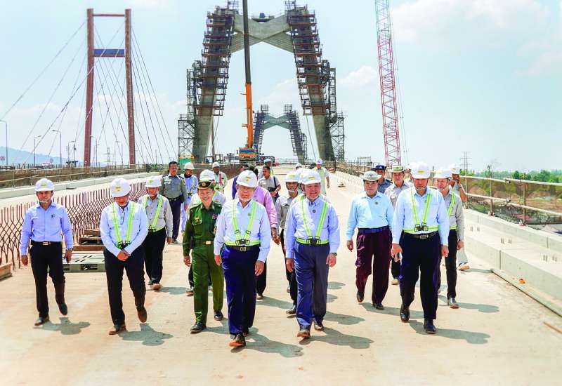 ဆောက်လုပ်ရေးဝန်ကြီးဌာန ပြည်ထောင်စုဝန်ကြီးဦးမျိုးသန့်သည် မွန်ပြည်နယ်ဝန်ကြီးချုပ် ဦးအောင်ကြည်သိန်း၊ ဌာနဆိုင်ရာတာဝန်ရှိသူများနှင့်အတူ ယမန်နေ့က အရှေ့-အနောက် စီးပွားရေးစင်္ကြံလမ်းမကြီး (East - West Economic Corridor) ပေါ်ရှိ အတ္ထရံတံတားအသစ် တည်ဆောက်ခြင်းလုပ်ငန်းခွင်သို့ရောက်ရှိရာ လုပ်ငန်းတာဝန်ခံက တံတားတည်ဆောက်ရေး လုပ်ငန်းဆောင်ရွက်ပြီးစီးမှုနှင့် ဆက်လက်ဆောင်ရွက်နေသည့် လုပ်ငန်းအစီအစဉ်များကို ရှင်းလင်းတင်ပြသည်။