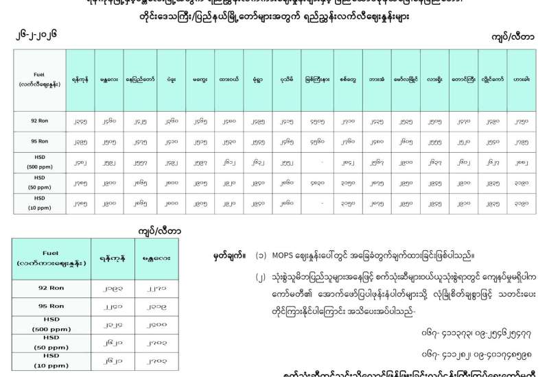 ရန်ကုန်မြို့နှင့် မန္တလေးမြို့အတွက် ရည်ညွှန်းလက်ကားဈေးနှုန်းများနှင့် ပြည်ထောင်စုနယ်မြေ နေပြည်တော်၊ တိုင်းဒေသကြီး/ပြည်နယ် မြို့တော်များအတွက် ရည်ညွှန်းလက်လီဈေးနှုန်းများ