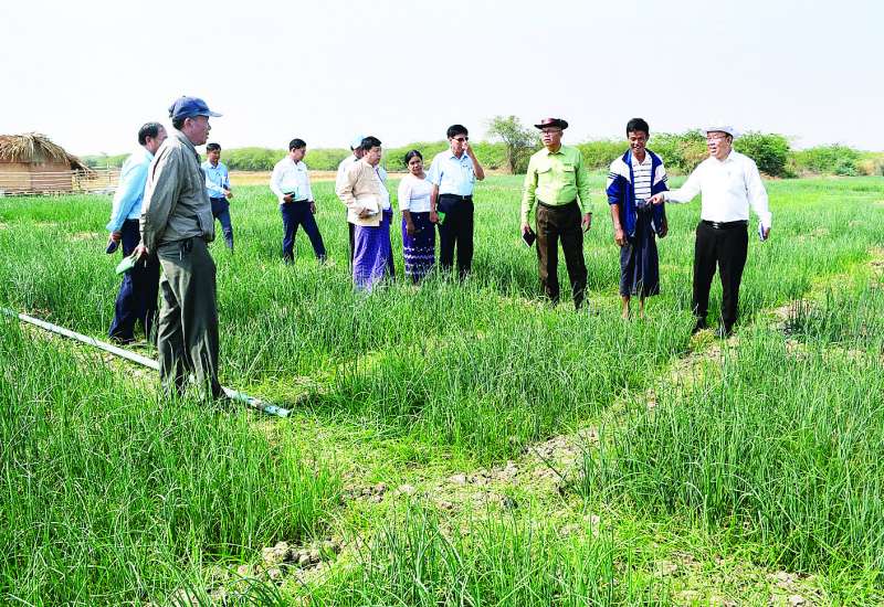 စိုက်ပျိုးရေး၊ မွေးမြူရေးနှင့်ဆည်မြောင်းဝန်ကြီးဌာန ဒုတိယဝန်ကြီး ဦးဗိုလ်ဗိုလ်ကျော်နှင့် တာဝန်ရှိသူများသည် ယမန်နေ့က ရန်ကုန်တိုင်းဒေသကြီး လှည်းကူးမြို့နယ် သနပ်ပြင်ကျေးရွာရှိ ငမိုးရိပ်ဆည်ရေသောက်စနစ် နွေစပါးစံပြ ၁၄၈ ဧက စိုက်ကွင်း ကို ကွင်းဆင်းကြည့်ရှုသည်။